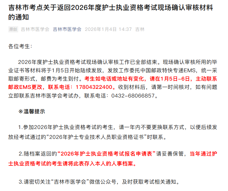 最新消息显示:吉林市考点已发布通知,明确2026年度护士资格考试现场确认材料的返还事宜。