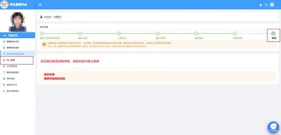 点击报考流程中的【报名缴费】节点,核对报考专业科目和金额,确认无误后按系统提示进行缴费。