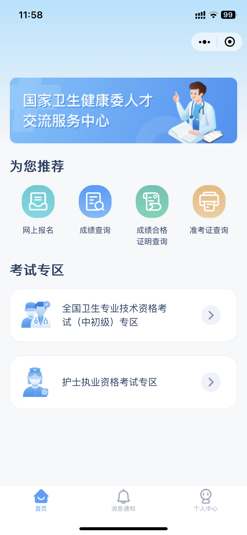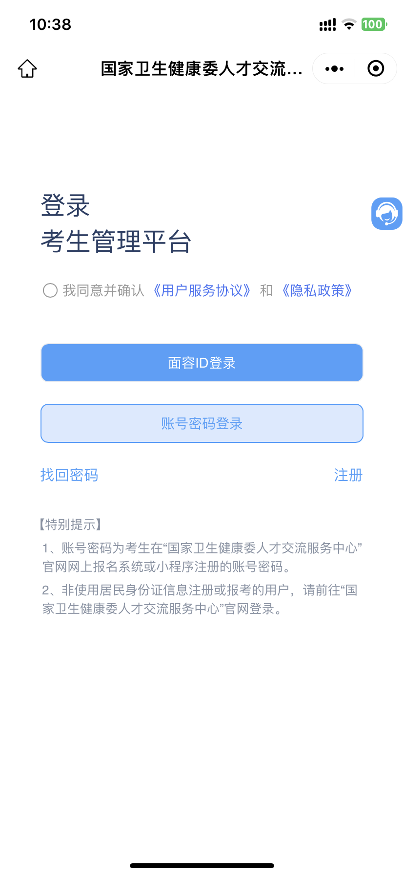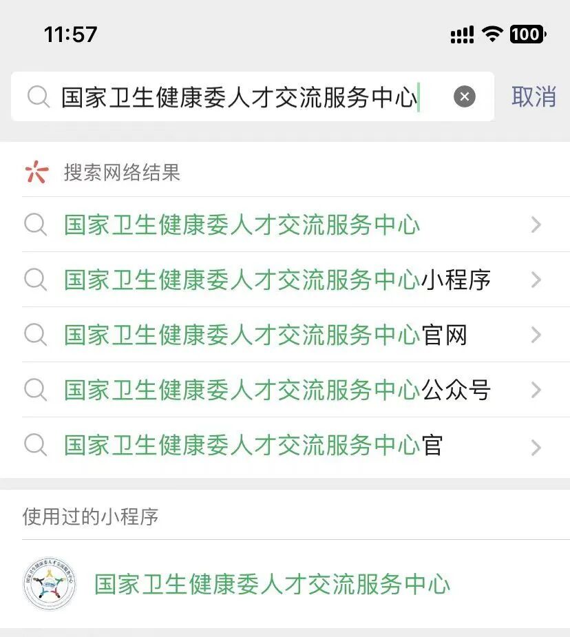 微信搜索“国家卫生健康委人才交流服务中心”小程序,进入考生管理平台登录界面。