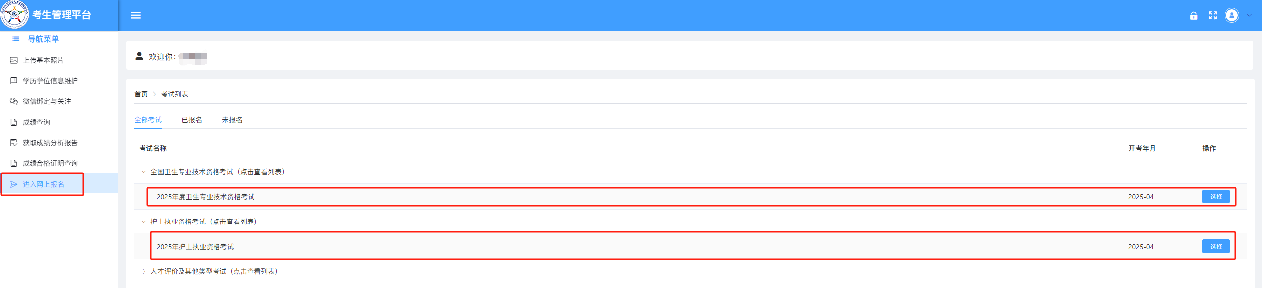 登录后点击左侧【进入网上报名】,选择对应的考试类别进入报名系统。