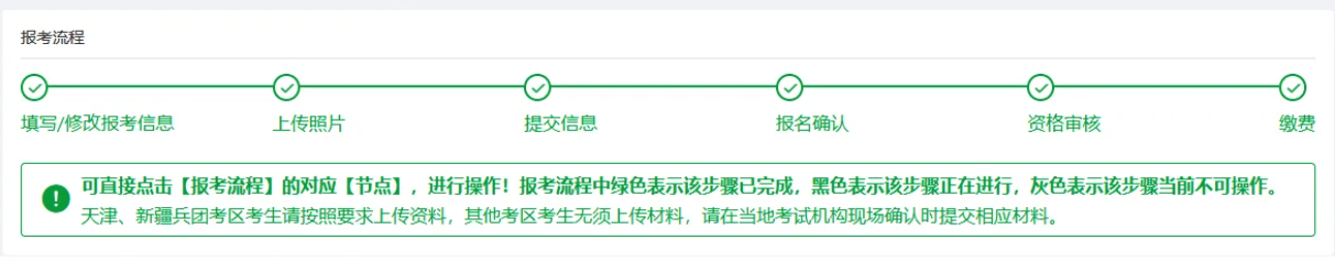 2、未开通网上缴费的考区,【资格审核】节点变绿即为报名成功。