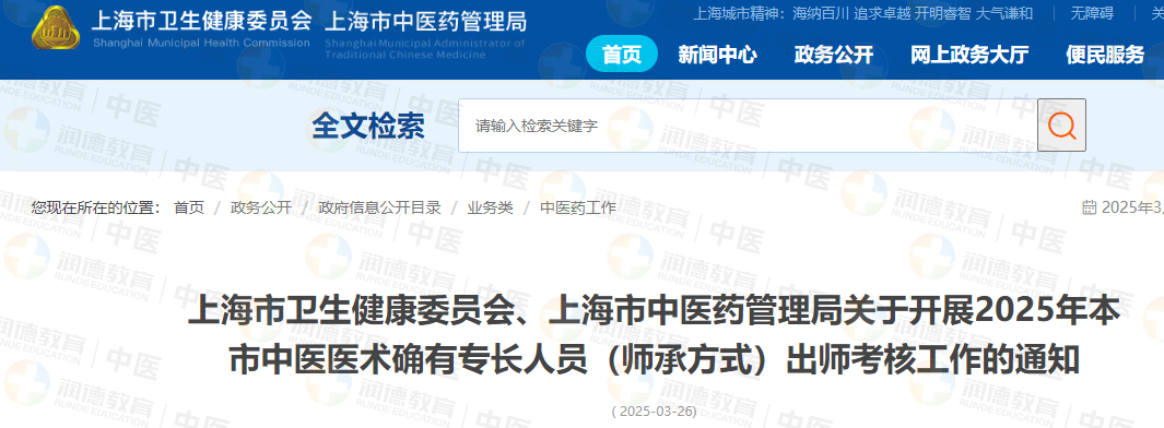 为做好2025年中医医术确有专长人员(师承方式)出师考核工作,根据《上海市中医药师承教育管理办法》(沪卫规〔2024〕14号)等文件规定,结合本市实际,现就出师考核有关工作通知如下。