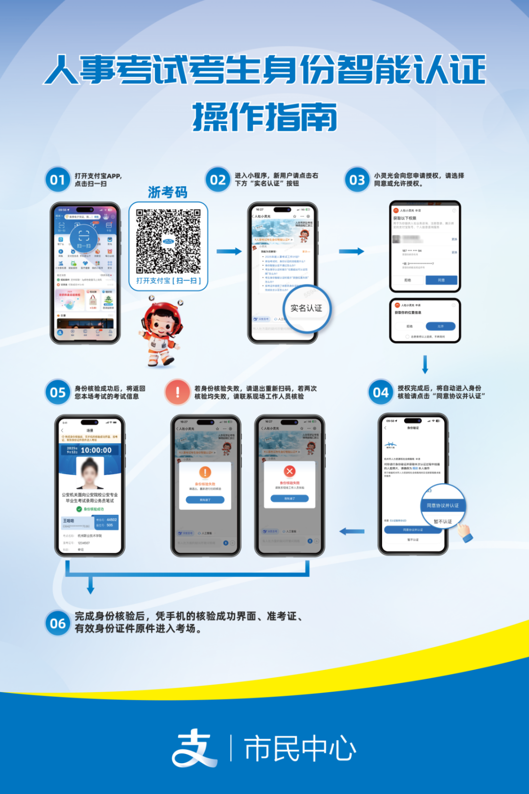(1)考试当天,请于每科目(场次)开考前1小时到达考点,在考点(考场)入口处使用支付宝扫一扫张贴的“浙考码”完成身份认证。