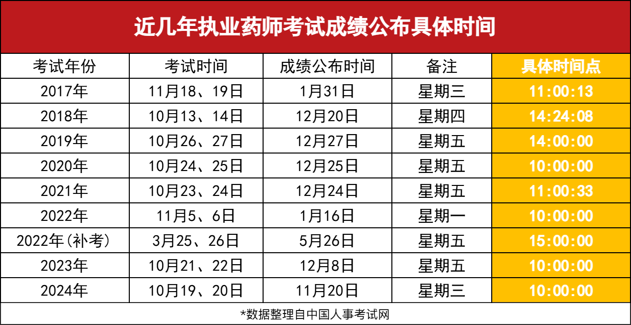 结合历年查分日期来推算,往年执业药师都是在周一、周五开通查分的几率最大。那么成绩公布的日期,很有可能就是11月17、21、24、28日这四天,除了两个周末期间,考生都需要重点关注下执业药师考试成绩。