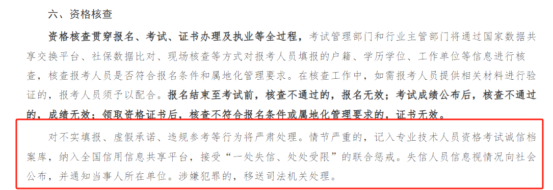 其中官方还明确:对不实填报、虚假承诺、违规参考等行为将严肃处理。情节严重的,记入专业技术人员资格考试诚信档案库,纳入全国信用信息共享平台,接受“一处失信、处处受限”的联合惩戒。失信人员信息视情况向社会公布,并通知当事人所在单位。涉嫌犯罪的,移送司法机关处理。