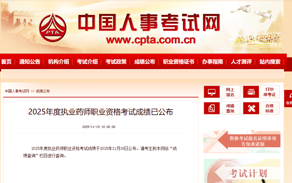 登录系统后选择参加考试的时间(2025年)以及考试名称(执业药师),进行成绩查询(见下图)。