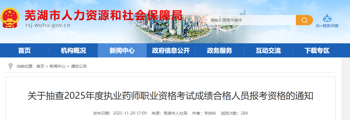 为落实专业技术资格考试事中事后监管职责,确保告知承诺制试点工作顺利推进,根据省人力资源社会保障厅《关于专业技术人员资格考试告知承诺制试点工作有关事宜的通知》(皖人社秘〔2020〕41号)和《关于2025年度执业药师职业资格考试安徽考区考务等有关工作的通知》(皖人社秘〔2025〕114号)要求,现对2025年度执业药师职业资格考试成绩合格人员报考资格条件进行抽查,抽查比例不低于合格人数的5%(抽查人员名单见附件),抽查通知后续也将以手机短信形式发送,请注意查看。