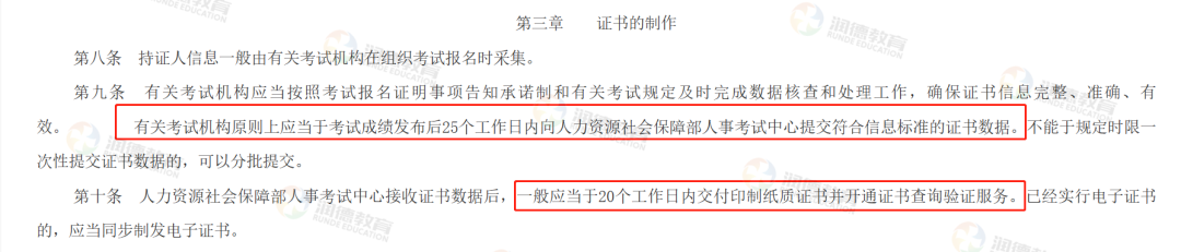 有关考试机构原则上应当于考试成绩发布后25个工作日内向人社部人事考试中心提交符合信息标准的证书数据。