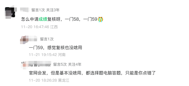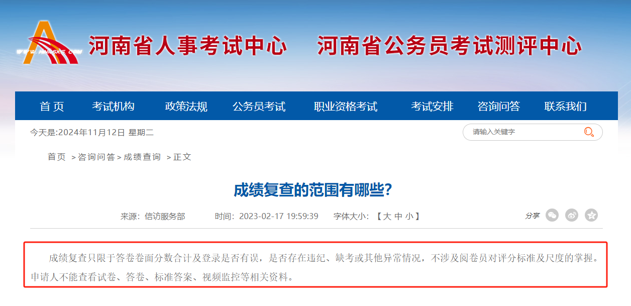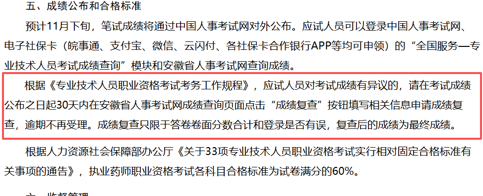 成绩核查范围:根据人力资源社会保障部办公厅关于印发《专业技术人员职业资格考试考务工作规程》的通知(人社厅发〔2021〕18号)文件规定,应试人员对考试成绩有异议的,应在考试成绩公布之日起30天内,向省级人事考试机构提出成绩复查申请。成绩复查只限于答卷卷面分数合计和登录是否有误。成绩复查过程中,工作人员不得向应试人员或其委托人出示试卷、答卷、标准答案、视频监控等相关材料,法律、法规另有规定的除外。复查后的成绩为最终成绩。