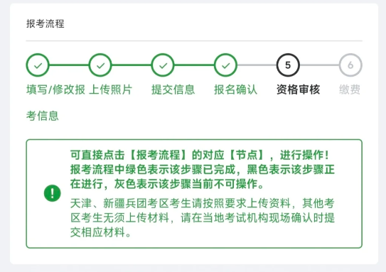 经报名点或考点确认后,【报名确认】节点变为绿色,同时【资格审核】节点变为黑色,接下来就是等待资格审核环节通过了。