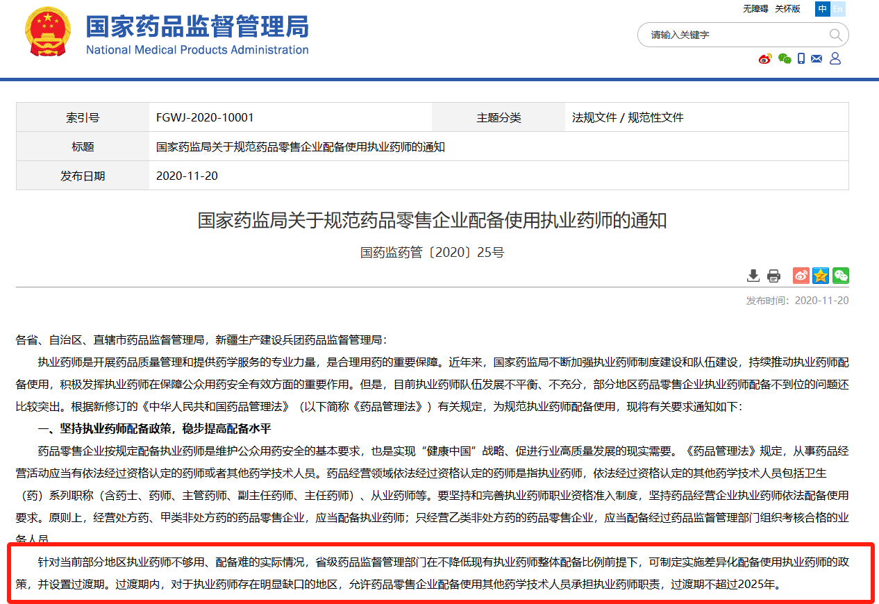 并且国家药监局此前也发布通知明确:针对当前部分地区执业药师不够用、配备难的实际情况,省级药品监督管理部门在不降低现有执业药师整体配备比例前提下,可制定实施差异化配备使用执业药师的政策,并设置过渡期。过渡期内,对于执业药师存在明显缺口的地区,允许药品零售企业配备使用其他药学技术人员承担执业药师职责,过渡期不超过2025年。