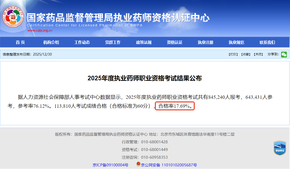 今天,国家药品监督管理局执业药师资格认证中心发布《2025年度执业药师职业资格考试结果》。