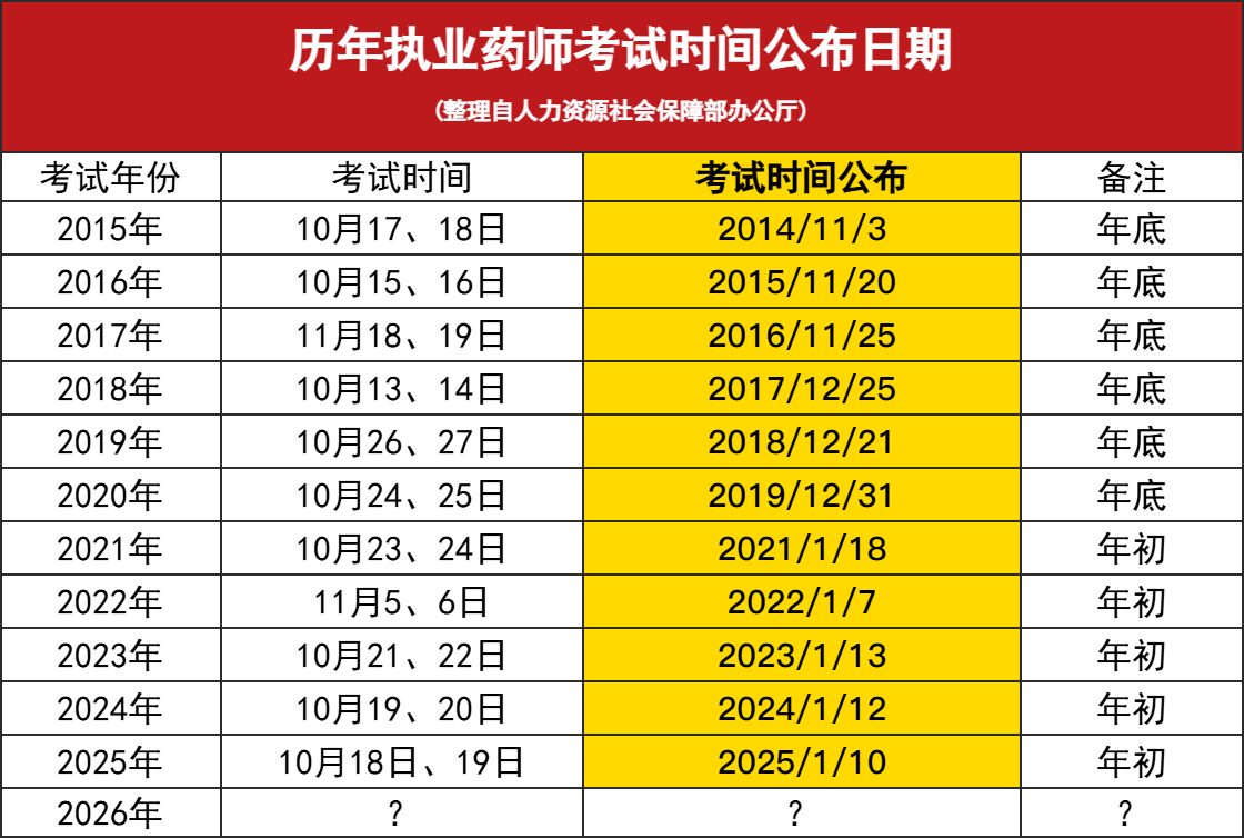 近几年的每年年初,人力资源社会保障部办公厅会公布新一年度的专业技术人员职业资格考试工作计划及有关事项的通知,内容包括新一年度专业技术人员资格考试时间表。执业药师时间也在其中。下图为2025年人社部办公厅公布的考试安排。