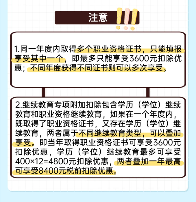 2.继续教育专项附加扣除包含学历(学位)继续教育和职业资格继续教育,如果在一个年度内既取得了职业资格证书,又存在学历(学位)继续教育,两者属于不同继续教育类型,可以叠加享受。即当年取得职业资格证书可享受3600元扣除优惠,学历(学位)继续教育最多可享受400x12=4800元扣除优惠,两者叠加一年最高可享受8400元税前扣除优惠。