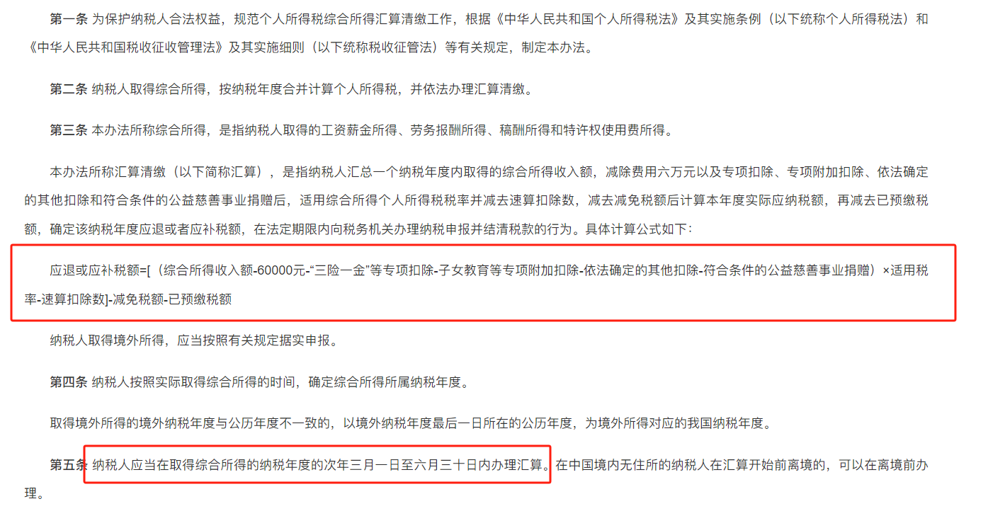 应退或应补税额=[(综合所得收入额-60000元-“三险一金”等专项扣除-继续教育等专项附加扣除-依法确定的其他扣除-符合条件的公益慈善事业捐赠)×适用税率-速算扣除数]-减免税额-已预缴税额