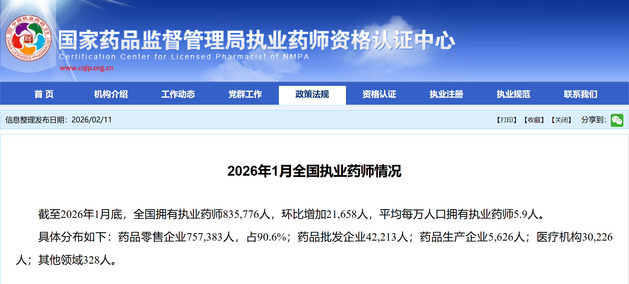 根据国家食品药品监督管理局执业药师资格认证中心官方网站的最新数据,截至2026年1月底,全国执业药师835776人,其中注册在药品零售企业的执业药师757383人,占注册总数的90.6%!