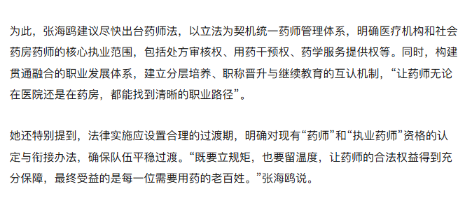 她还特别提到,法律实施应设置合理的过渡期,明确对现有“药师”和“执业药师”资格的认定与衔接办法,确保队伍平稳过渡。“既要立规矩,也要留温度,让药师的合法权益得到充分保障,最终受益的是每一位需要用药的老百姓。”张海鸥说。