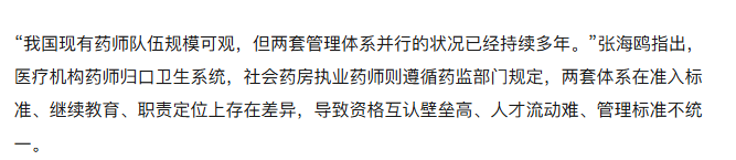 张海鸥指出,我国现有药师队伍规模可观,但两套管理体系并行的状况已经持续多年。医疗机构药师归卫生系统,社会药房执业药师则遵循药监部门规定。