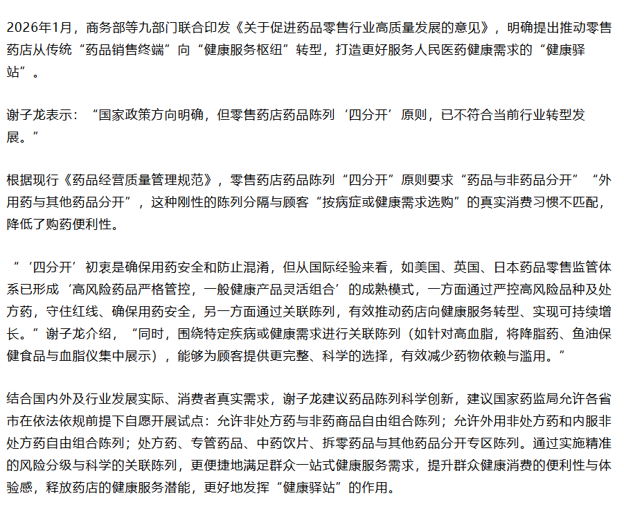 2026年1月,商务部等九部门联合印发《关于促进药品零售行业高质量发展的意见》,明确提出推动零售药店从传统“药品销售终端”向“健康服务驿站”转型。