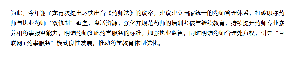 其中,张海鸥(北京白塔寺药店连锁有限公司总药剂师)和谢子龙(老百姓大药房董事长) 两位代表关于加快制定出台《药师法》的建议,引发了广泛关注。