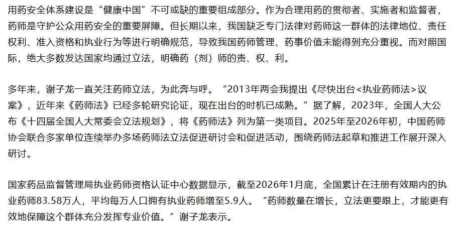 [3] 中国医药报. 谢子龙代表:尽快出台药师法,构建医疗服务高质量发展新格局. 2026-03