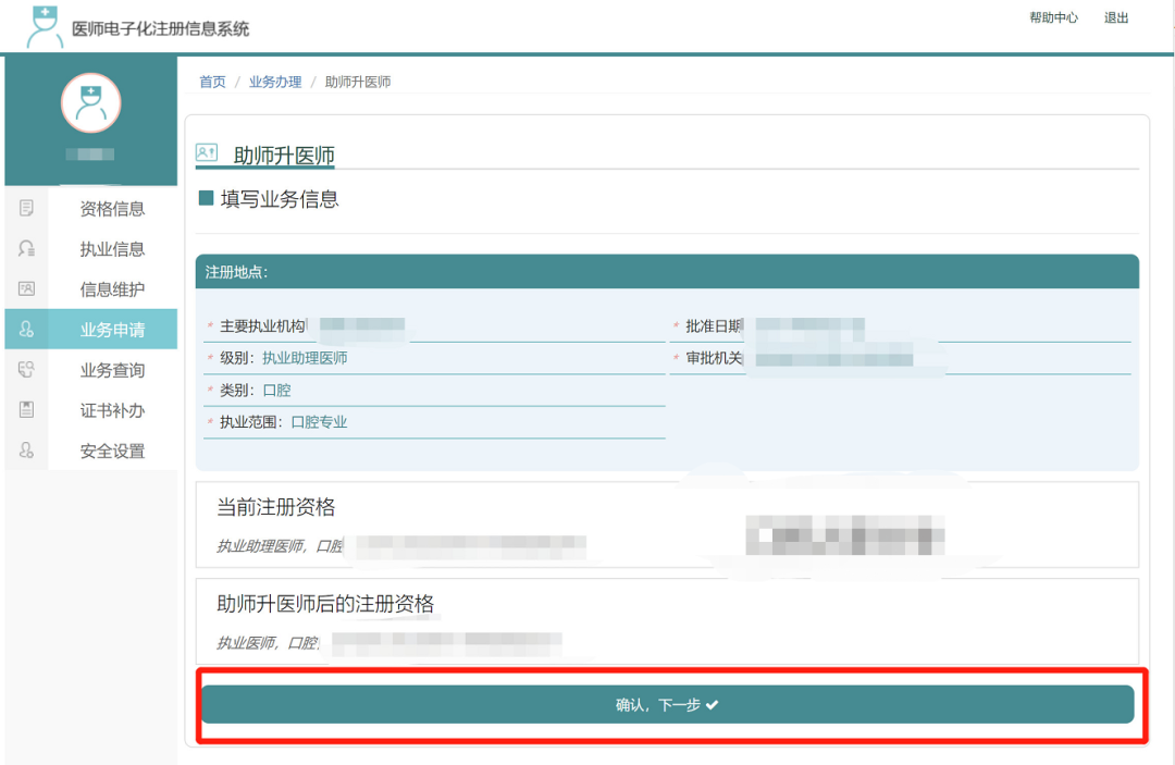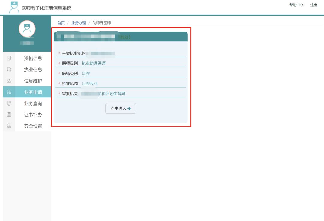 2)助理升执业(同一个医疗机构),点击业务申请,选择助理升执业