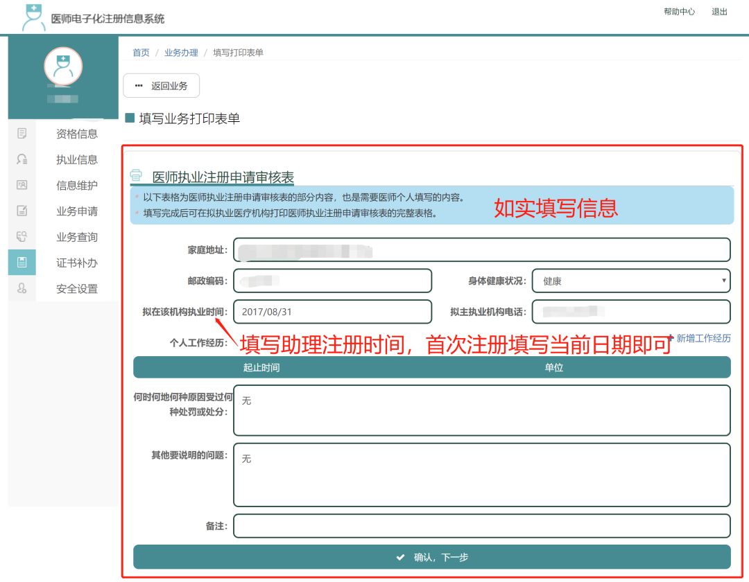 1)首次医师注册或者助理升执业改变注册地点,需点击业务申请,选择注册,如实填写各项信息后提交,等待医疗机构审核后在机构端打印《医师执业注册申请审核表》。