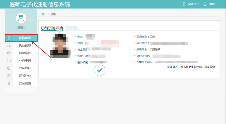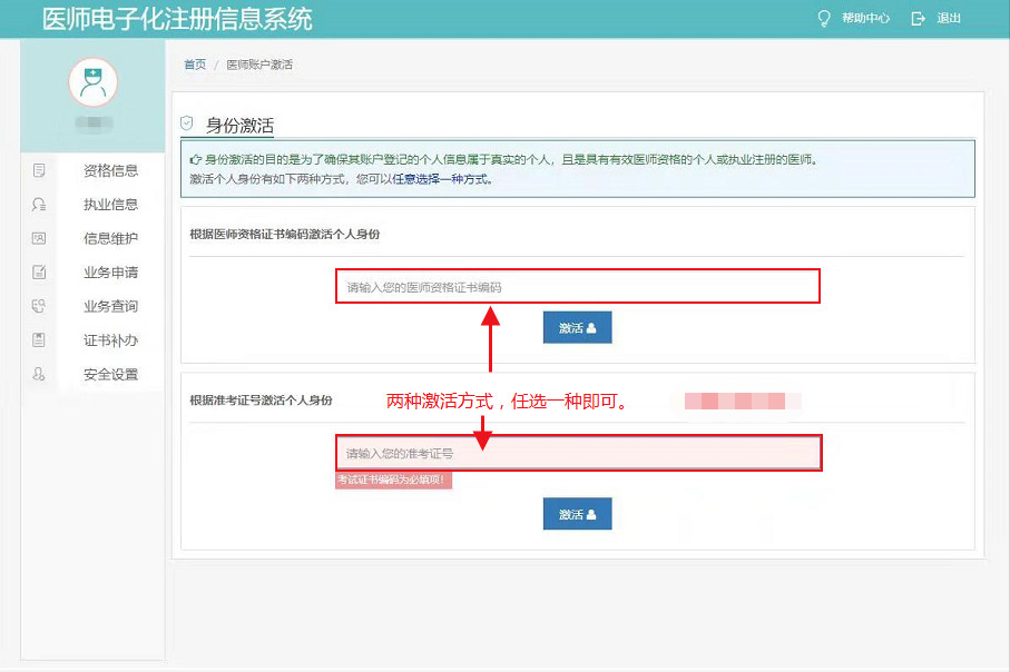 激活账户,用户登录后,需验证您的手机号,激活个人身份,激活后可点击资格信息查询个人医师信息。