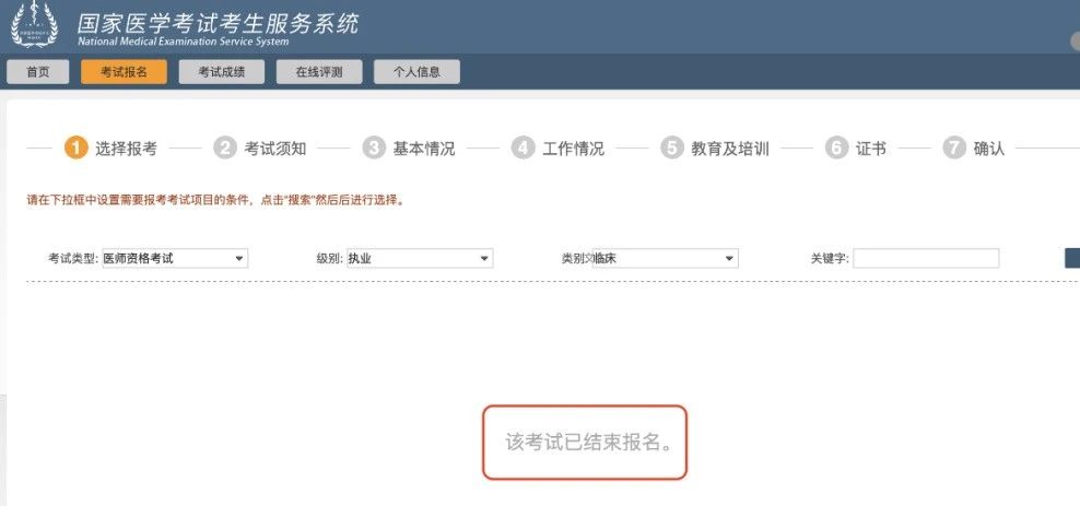 提醒各位,虽然首页显示“开始新的报名”,但是内页仍然显示的是“该考试已结束报名”。2026年医师考试报名尚未开始,不过官方既然在调整页面,说明快报名了!