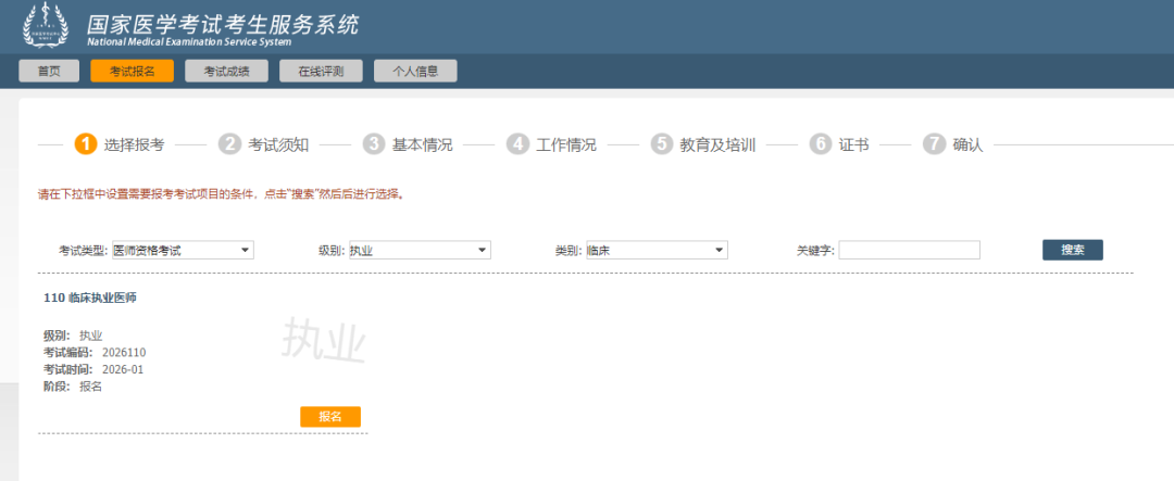 开始报名后,首先需要选择报考考试科目(医考考试即为考试类别/级别)。由于考试科目繁多,用户可通过设置页面顶部的筛选条件进行检索。
