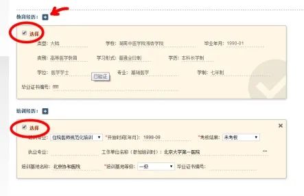 用户需要选择用于报考的教育经历和培训经历内容,勾选相关经历条目的左上角选择框完成选择。