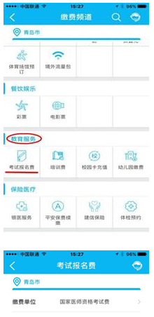 (1)找到缴费项目。登录建行最新版手机银行客户端,选择菜单栏“悦生活”→“行政教育”→“考试报名费”,选择“山东省青岛市”→“国家医师资格考试费”,点击“下一步”