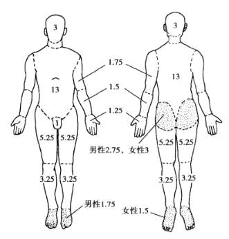 中国新九分法,将体表面积划分为11个9%的等分,另加会阴的1%,构成100%的总体表面积,即: