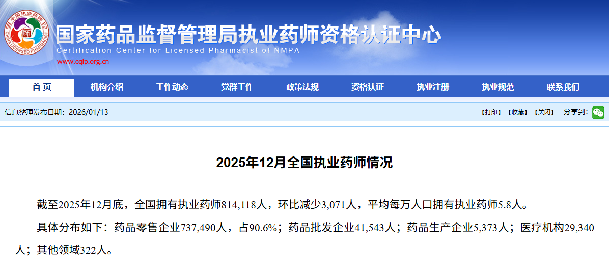 近日,国家药监局执业药师注册中心公布2025年12月最新注册数据,在岗执业药师,注册人数在81.4万人。