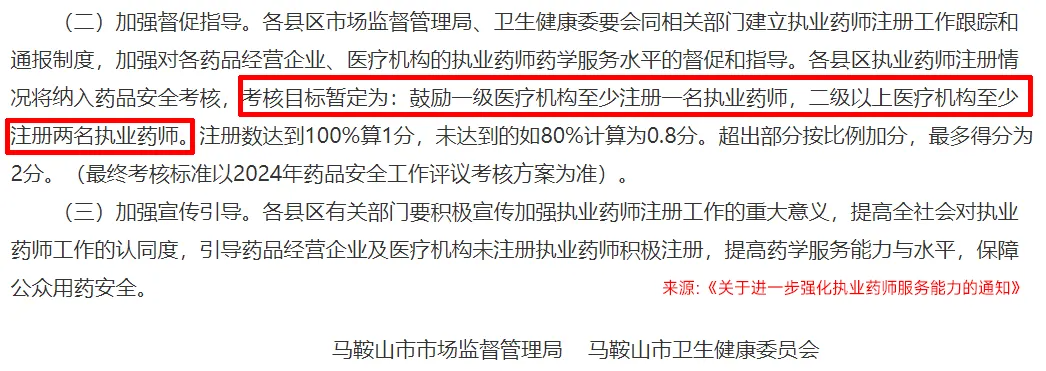 部分医院药房招聘执业药师,此前,安徽多地曾发文鼓励医疗机构注册使用执业药师,并明确各级医疗机构执业药师注册目标:
